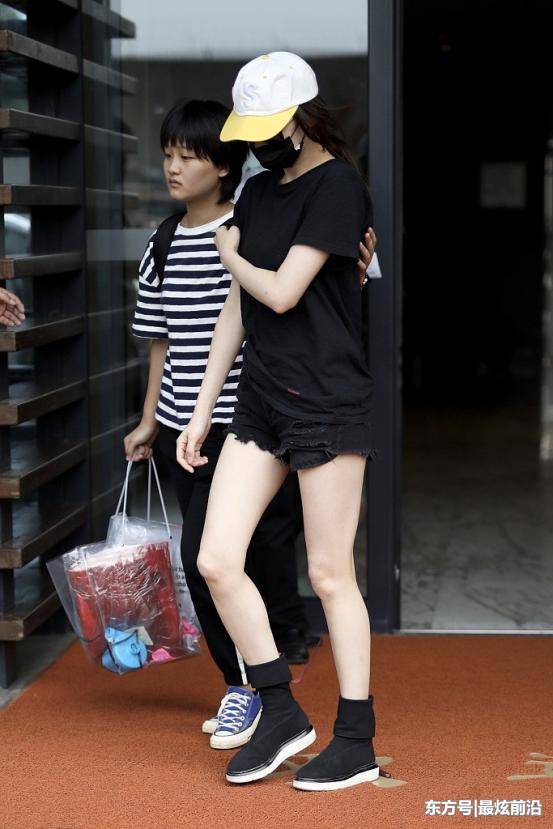 同样是一组机场照,迪丽热巴选择的却是深色系的黑色装。上身是普通的黑色T恤,下身则选择了同色的黑色牛仔超短裤。这身搭配无疑也暴露了迪丽热巴的大长腿。
